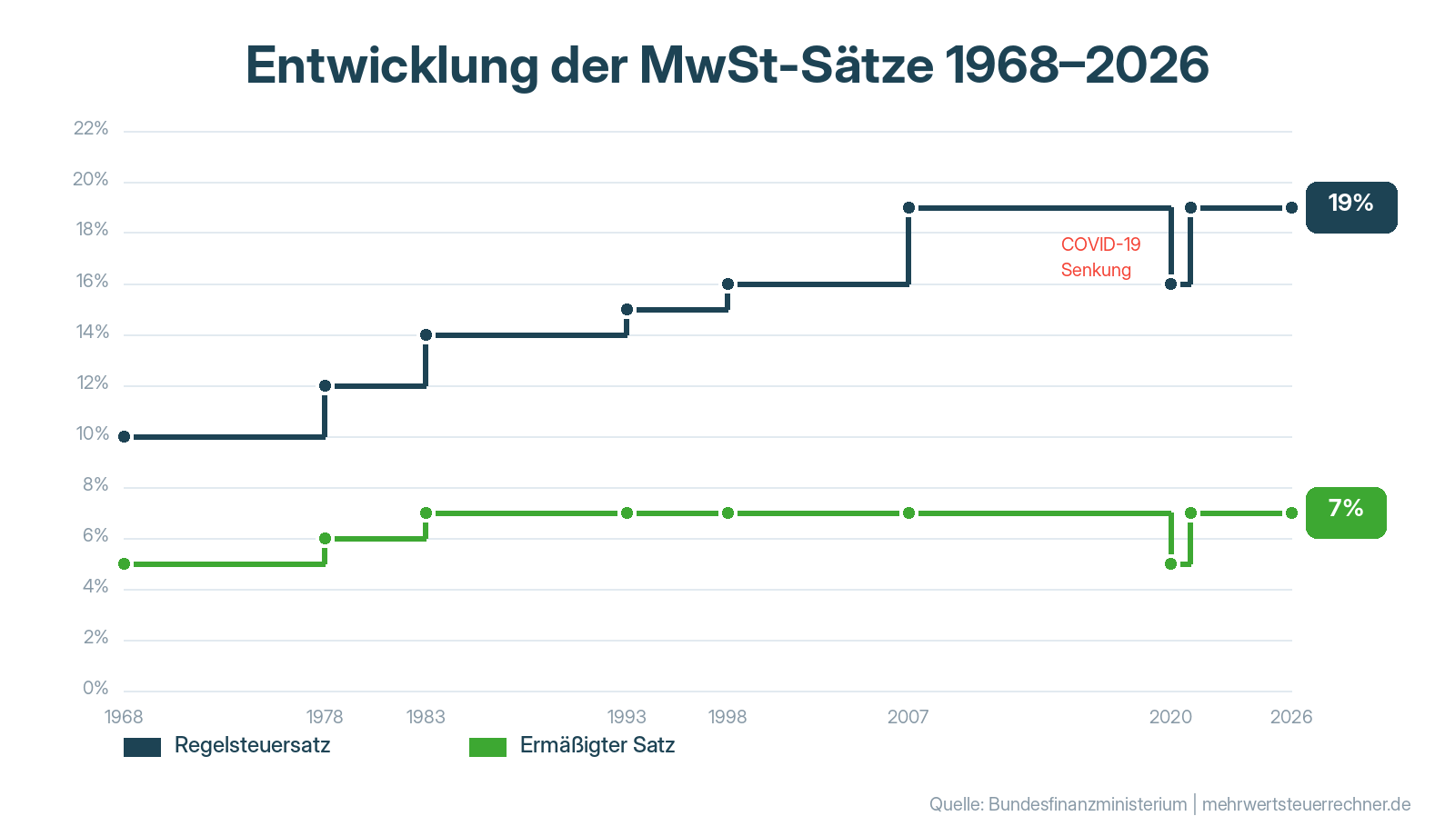 Abb. 1: Entwicklung der Mehrwertsteuersätze in Deutschland von 1968 bis 2026. Quelle: Bundesfinanzministerium