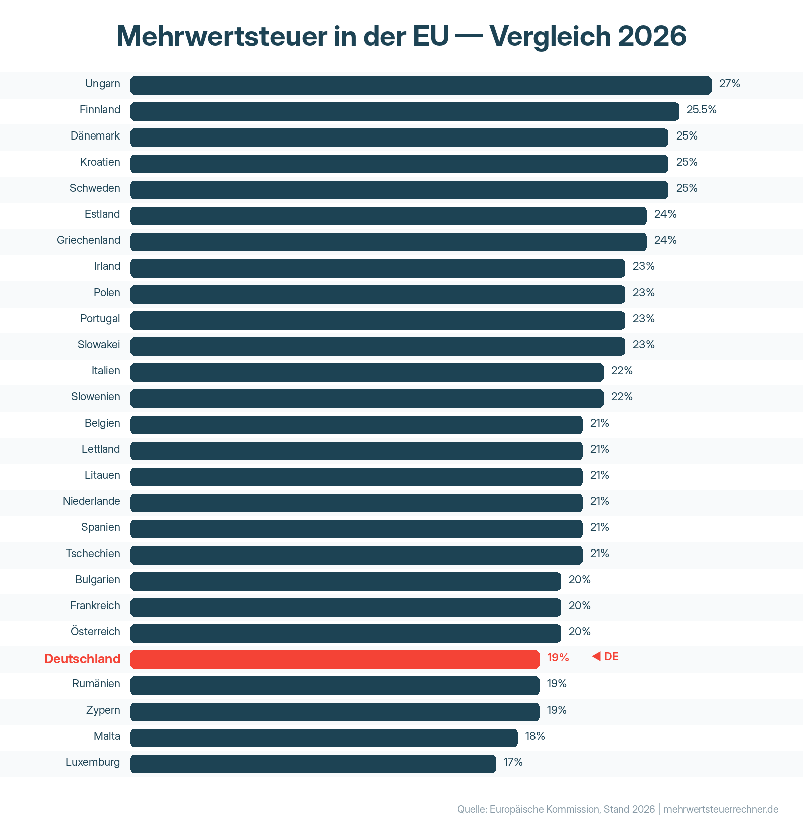 Abb. 2: Mehrwertsteuer-Vergleich in Europa 2026. Deutschland liegt mit 19 % im Mittelfeld der EU. Quelle: Europäische Kommission